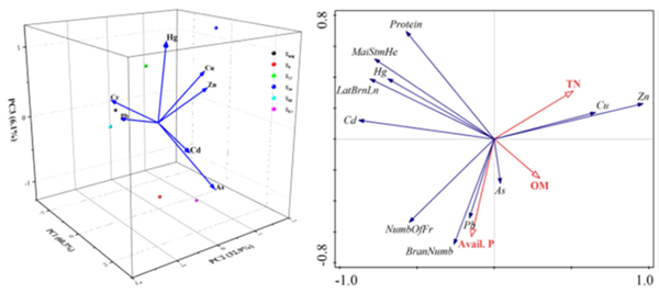 施用沼肥后土壤的As和Hg含量显著增加,Pb和Cr含量显著减少。Cd在原始土壤中未检到,但在施用沼肥后的土壤中含量增加。根据综合污染系数,种植后土壤处于清洁的状态。但潜在生态风险指数显示,施用沼肥种植后土壤的潜在生态风险高。根系土壤重金属污染物主成分分析也表明,土壤中重金属除受试验区自然地质背景因素的影响,主要受沼肥施用的影响。
