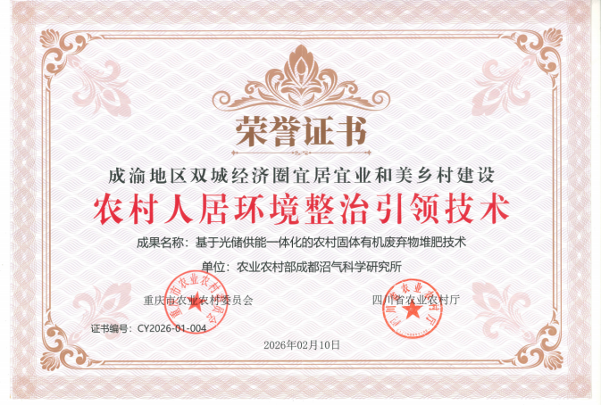 为落实党的二十届四中全会精神,推动宜居宜业和美乡村建设,促进成渝地区农村人居环境整治水平整体提升,由重庆市农业农村委员会、四川省农业农村厅共同组织的成渝地区双城经济圈宜居宜业和美乡村建设引领技术和典型案例征集活动,近日正式发布评选结果。农业农村部成都沼气科学研究所乡村人居环境污染治理创新团队研发的“基于光储供能一体化的农村固体有机废弃物堆肥技术”获评农村人居环境整治引领技术。