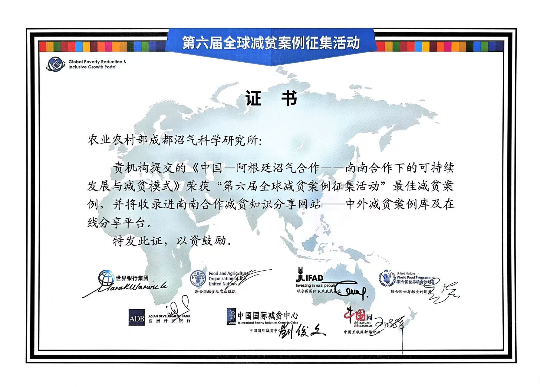 沼科所选送的《中国—阿根廷沼气合作——南南合作下的可持续发展与减贫模式》案例荣获“第六届全球减贫案例征集活动”最佳减贫案例。