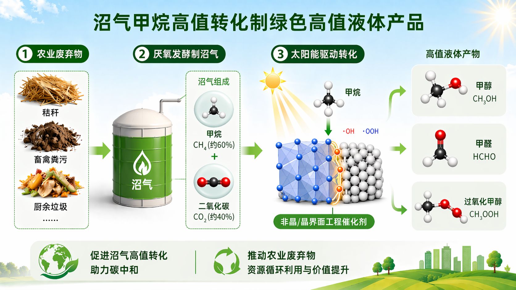 甲烷是沼气的主要成分,也是重要的碳氢资源。把沼气中的甲烷高效转化为绿色甲醇、甲醛等液体高值化学品,对于提升沼气利用价值具有重要意义。针对甲烷不容易转化、反应中又容易直接变成二氧化碳等难题,研究团队设计了一种由非晶相和晶相半导体组成的新型复合催化体系,实现了对反应过程的有效调控。研究表明,该体系在室温光照条件下,只用水和氧气作氧化剂,就能将甲烷转化为绿色甲醇、甲醛等高值液体化学品,反应活性优于目前大多数已报道体系,选择性达到98%以上。这项成果为沼气甲烷制备绿色高值化学品提供了新的技术思路,也为碳中和背景下推进沼气高值化利用、促进农业废弃物资源循环利用与固碳提值提供了有力支撑。