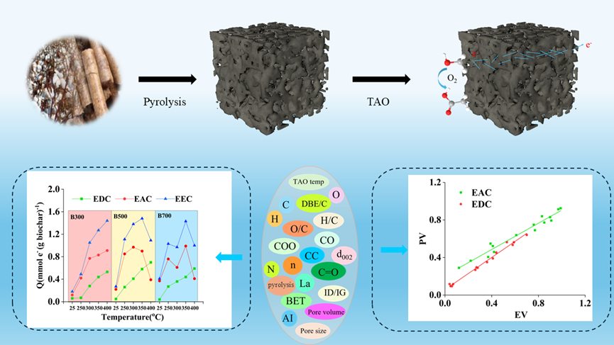 生物炭的氧化还原活性对多种生物及非生物过程具有重要影响。本研究提出热空气氧化作为一种绿色策略,可将生物炭的电子供给能力可提升10倍以上,电子接收能力可提升数倍。机器学习分析进一步揭示:电子供给能力主要受碳结构特性调控的电子迁移率影响,而电子接受能力则主要受活性位点数量制约。该成果有助于促进生物炭氧化还原活性的精准调控,从而促进其在多种生物和非生物介导的氧化还原过程中的应用。